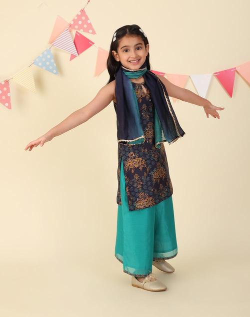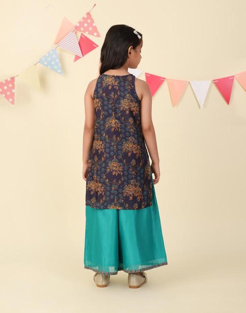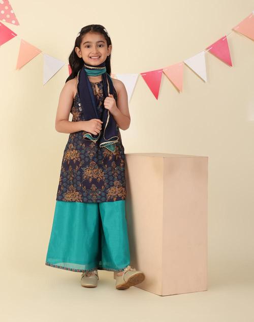 Navy Cotton Silk Blend Hand Block Printed 3pc Palazzo Set